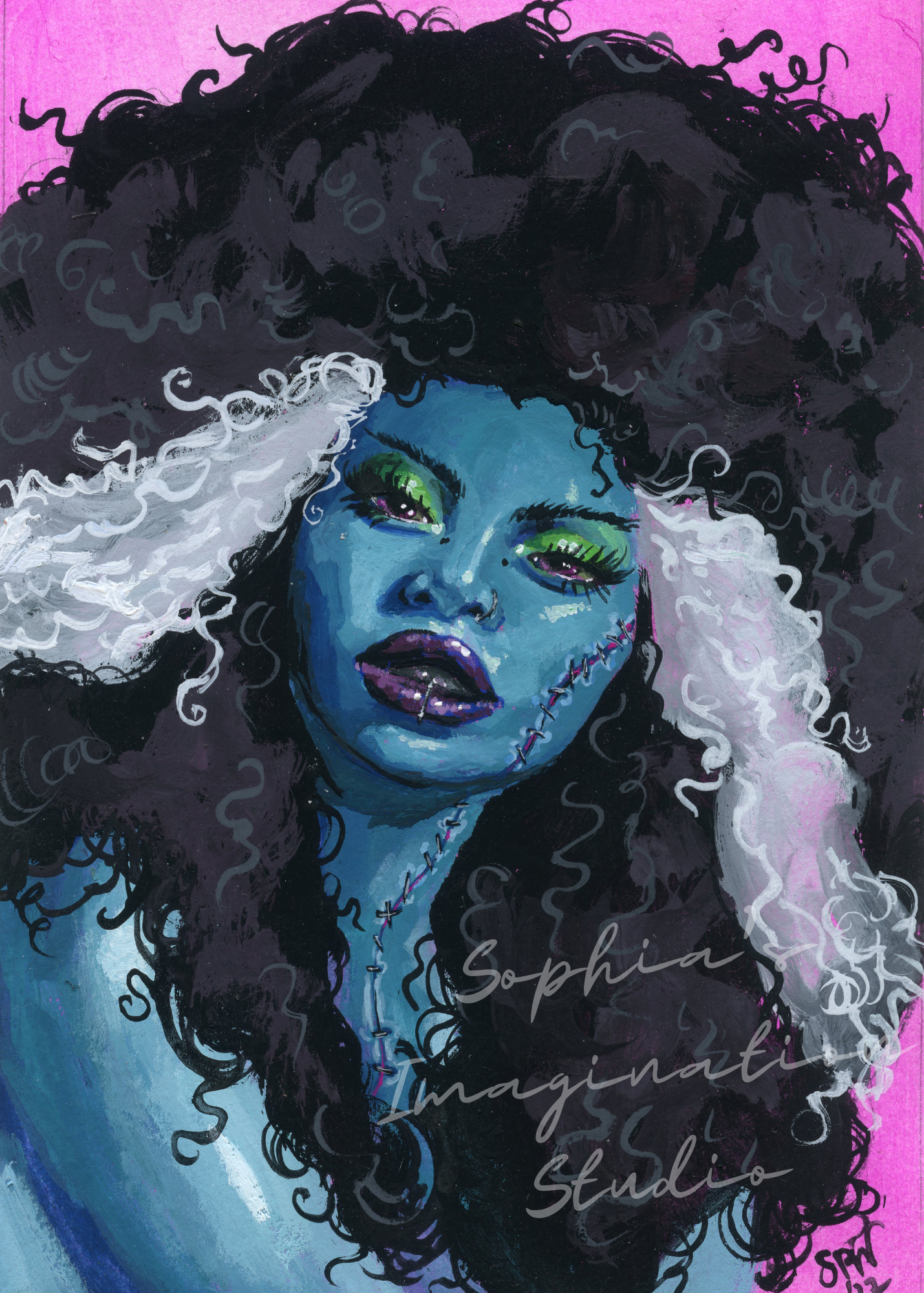 This is a print of my original gouache painting inspired by the 1935 horror sci-fi film Bride of Frankenstein. She didn’t ask to be created, but if she’s gonna be reanimated, she’s showing up in full glam with lightning in her veins and zero tolerance for mediocre men.